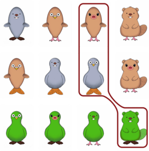 Vyberte si jedno zvieratko, napr. bobor. Povyberajte karty, na ktorých sa nachádza bobrie telo (27 kariet) a ostatné karty odložte do krabičky. Karty v tomto prípade budú mať 3 elementy po 3 vlastnosti: