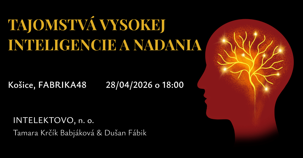Pozývame Vás na fascinujúcu prednášku Tajomstvá vysokej inteligencie a nadania, ktorú vám prinesie špeciálna pedagogička Tamara Krčík Babjaková a renomovaný psychológ Dušan Fábik z organizácie INTELEKTOVO, n.o. Obaja sú dlhoroční odborníci v oblasti vysokej inteligencie a nadania a sú pripravení podeliť sa s vami o svoje skúsenosti a vedomosti. Prednáška odhalí štyri zaujímavé oblasti:
